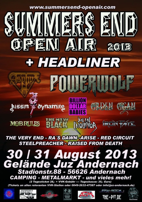 unter dem Namen Summers End Festival Open Air Andernach, geht das legendäre Festival des Juz-Live-Club Andernach diesmal an 2 Tagen an den Start. Jede Menge Bands werden dem feierwütigen Publikum mächtig einheizen und dem Sommer einen würdigen Abgang verschaffen. 2 Tage, 14 Bands, Camping - lecker Essen, lecker Trinken!