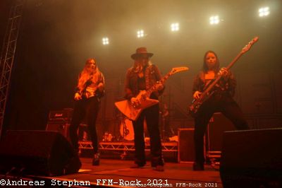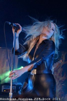 Tatsächlich habe ich mich vor allem wegen einer Band akkreditieren lassen: THUNDERMOTHER. Die vier Schwedinnen sind die einzigen, die sich auch von der Pandemie nicht vom live spielen abhalten lassen. Wo immer es die Bestimmungen zulassen sind FILLIPA NÄSIL, GUERNICA MANCINI, EMLEE JOHANSSON und MONA LINDBERG am Start und nie würden sie auf die Idee kommen eine ganze Tour abzusagen, nur weil einzelne Konzerte nicht stattfinden können. So hat man sich eine treue Fangemeinde erspielt und die steht wie immer in Form des Fanclubs in der ersten Reihe, um die Mädels abzufeiern. Allerdings lässt sich auch der Rest des gut gefüllten Zelts nicht lange bitten und so wird der Auftritt der Mädels zum ersten echten Highlight des Wochenendes. Kritiker mögen sie als AC/DC-Kopie bezeichnen aber die Zeiten, in denen Angus &Co. dermaßen in den Arsch traten, sind lange vorbei. Wer also noch nicht in den Genuss eines THUNDERMOTHER-Konzerts gekommen ist, der sollte dies schnellstens nachholen.