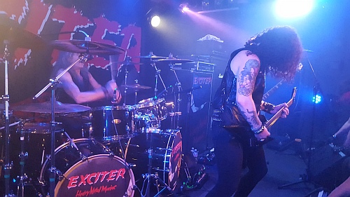 Licht und Sound in der Goldgrube stimmen. Alle drei sind sehr gut aufeinander eingespielt. Die beiden im gesetzteren Alter befindlichen Bandkollegen Dan Beehler und Allan Johnson (beide auch Ü 60 – Respekt!) bilden zusammen mit Gitarrist Daniel Dekay ein arschtight zu Werke gehendes Triple. Gitarrist Daniel Dekay und Bassist Allan Johnson gewohntermaßen straight am Tieftöner agierend, wechseln häufig von einer Seite auf die andere, posieren bei Bedarf gemeinsam, während Bandkopf Dan Beehler kraftvoll auf Becken und Felle hauend unmittelbar den Takt vorgibt. Der singende Drummer lebt seine Musik mit purer Leidenschaft, Herz und Seele. Sein raues Organ hat nichts an Kehligkeit verloren. Seine Drumschläge sitzen wuchtig konzentriert auf den Punkt gebracht im Regelfall taktgenau präzise wie nur ein Schweizer Uhrwerk läuft. Was Daniel Dekay an der Sechssaitigen rausfeuert, inklusive gekonnter Posen sowie zugehöriger Mimik, kommt druckvoll, hat Klasse, Wiedererkennungswert, es klingt genauso heavy, abgedreht und schräg, wie EXCITER es in ihrer 80er-Phase drauf hatten, inklusive auf dem Rücken Gitarre spielen, demonstrativem Axt hochreißen, sie bis zum Anschlag röhren, quietschen, kreischen lassend im Stand zu verharren.Eine gesunde Spur Rotz-Räudigkeit darf bei EXCITER nicht fehlen auch der MOTÖRHEAD-Einschlag sticht bei den Kanadiern markant hervor. Was könnte diesen kultigen Set als laut von den Fans geforderter Zugabesong mitnichten würdiger beenden als ein sinnvollerweise am Schluß den Pit mächtig zum Toben bringes „Iron Fist“-Cover des kultigen Warpig-Trios MOTÖRHEAD? Passt!