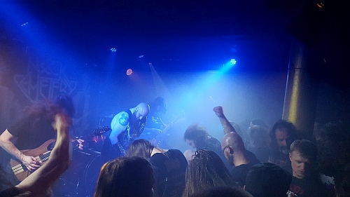 In der Goldgrube herrscht Ausnahmezustand. Die ganze Hütte tobt von Anfang bis Ende!  Beginnend mit dem Eingangsopener „Steel and Silver“, gehen unaufgefordert alle Fäuste im Saal hoch, jedes Wort wird Silbe für Silbe mitgesungen. Letztes mal noch als Wahlstück außen vor bleibend kommt diesmal amtlich „Hammerforged“ gefolgt vom das gesamte Ambiente mitsingen lassenden Epic-Hammer „Traitors Gate“ - geil! Mit „Dungeon Master“, „Mammoth Rider“, „Abysswalker“ und einem flott aus der Hüfte geschossenen „Outlived Them All“ folgen vier Paradehymnen hintereinander, denen sich ein wuchtiges MANILLA ROAD-Cover „Necropolis“ gewidmet zu Ehre des 2018 verstorbenen Band-Frontmanns Mark 'The Shark' Shelton (R.I.P!) anschließt. Wenn Jake die epischen Parts mit der Fankulisse intoniert, verteilt sich im ganzen Raum soviel unheimlich mystische Atmosphäre, das sich alle Nackenhaare senkrecht aufstellen! Der unwiderstehliche Blutschwur „Blood Sacrifice“ löst ebenfalls massiv Bewegung aus, zunächst klatscht das Publikum während des heroischen Einstiegsparts rhythmisch im Takt nutm danach wird mächtig auf's Tempo getreten, geheadbangt, was das Zeug hält und jede Matte hergibt, ehe es in kraftvollen Stampfrhythmus, danach inklusive Singalongs in satt vorwärts preschendes Speedtempo, am Ende abermals in heroische Strukturen übergeht...und der Gänsehautfaktor bis zum Schluß wächst!