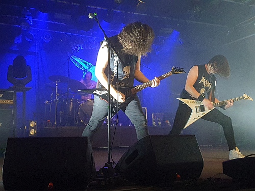 geben der zahlreich erschienenen Teutonenstahlfraktion im Rahmen ihres aktuell 35jährigen Bandjubiläums, dessen History mit 13 Studioalben aufwartet, mächtig auf die Glocke. Das sympathisch auftretende Hanseatenquintett gibt sich beim Heimspiel - inklusive stilvollem Einstieg mit atmosphärischem Conan-Film-Intro, - besonders motiviert, das ist allen Bandmitgliedern jederzeit anzusehen. Frontmann Andreas 'Buschi' Babuschkin nimmt zunächst einen kräftigen Schluck aus der Hochprozenter-Pulle (Möglicherweise Wodka oder Whisky) um vor dem Auftritt seine Stimmbänder kräftig (ein)zu ölen. PARAGON präsentieren sich in prächtiger Form! Oldschoolhämmer en Masse haben PARAGON für ihre Fans parat, eine vom neuen 'Metalation-Album', dafür u. a. "Legions Of Metal", "Law Of The Blade", "Palace of Sin", "Green Hell", "Impaler", "Thunderstorm" und "Armies Of The Tyrant". Beide Gitarristen Martin Christian und Jan Bertram liefern sich rasante Duelle, singen einige Backgroundvocals und posen mit ihrem so ziemlich alle Background-Vocals singenden Bassisten Jan Bünning kräftig um die Wette. Drummer Jason Wöbcke sorgt durch wuchtigen Punch für heftig Dampf hinter der Kesselbude. Auch diesmal gilt das ungeschriebene Gesetz: PARAGON sind eine Bank für packende Live-Gigs, das beweisen sie auf dem HOA in aller Deutlichkeit!