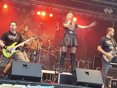 Weitere Hymnen wie „Crossroads“, „Kingslayer“ (Kein NIGHTWISH-Cover), „Mystic Knights“; „Tyrants Crown“, entfalten schon nach kurzer Zeit Wirkung. Danach ist erstmal Zeit für ne Ansage, Sängerin... stellt die Band vor, ehe es dann mit „Meteoriter“, „Ashed Remain“, „Ardent Wave“ und „Destruction“ wobei der Titel diese mehr Speed/Thrash denn Power Metal beinhaltende Killer-Brett ausnahmslos hält, was er verspricht. Zwar besteht die Frankfurter Band erst seit dem Corona-Jahr 2020 was allerdings nicht viel zu sagen hat, denn sie liefert in Welferode einen wirklich großartigen Auftritt, der sich amtlich gewaschen hat! Mit der Wucht einer Stahlwahlze wird sowohl harte Kutten-Trägerschaft zum intensiven Headbanging gebracht als auch zeitweise Pogend sich auf den Hochlandwiesen austobendes Fan-Volk, das reichlich viel Spaß am Gig hat. Das Gitarrenduo Tim Kremer/Jochen Bär soliert und rifft sich kraftvoll auf exzellentem Level in einen gewaltigen Rausch, der alle Fans auf dem Platz mitreisst! Sängerin Svenja mit fülliger Haarpracht, schwarzen Rock und hohen Stiefeln ist nicht nur optisch in Sachen Outfit ein echter Blickfang. Die sympathisch-ehrlich auf der Bühne zeigend wo's lang geht, auch gerne ausgiebig headbangende Sängerin stellt sich vermehrt auf die Box, sie verfügt ein immens vielseitiges Repertoire an Mimiken und zugehöriger Gestik. Dass die hübsche Blonde ihren kraftvollen Stimmbändern zwischendrin auch mal harrsche  teils zum Death Metal rüberluckende Growls entlockt sorgt für Erstaunen, und passt prächtig ins Gesamtbild. Selbiges gilt für Markige Ansagen mit denen sie die Meute auf dem Platz verstärkt pusht, um das feiernde Fanvolk zu ermuntern kräftigs aus sich herausgehen und entsprechend alles zu geben!