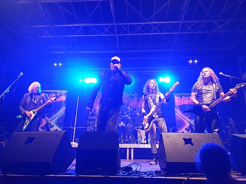 sorgen am Schluß nochmal für einen fetten Abriss, zu dem das zahlreich vor der Bühne rockende Publikum steil geht. Mit den Gitarristen Ronny von Assel (früher TRANS AM und G'LOYD), Burk Hard und Sänger Andreas von Lipinski stehen festivalerfahrene Musiker auf der Bühne, die u. a. schon mit WOLFEN bzw. der Nachfolgeband WARWOLF auf der HOCHLANDROCK-Bühne zu Gast war, wirkte auch bei Albumproduktionen von GRAVE DIGGER als Hintergrundsänger mit und steht zudem in Reihen der Kölner Heavy/Power Metaller VERITATES. Tom Panathiokas ist (zumindest für Kenner) kein Unbeschriebenes Blatt. Der in den 90ern bei SYMMETRY und BRITISH STEEL aktive Drummer weiß wie ne fette Kelle geschwungen wird. Ergänzt von dem Jüngsten Bandmitglied Bassist Trifon steht hier ein gestandener Heavy Metalfünfer auf den Brettern, der einen fetten Heavy Metalband amtlich krönt! Andreas von Lipinski auch 'Lippi' genannt ist schon mehrfach auf dem HOCHLANDROCK gewesen von daher kein wirklich Unbekannter auf dem Welferoder Festwiesen. Über dessen knackig reisserischen Sprüche bedarf es überhaupt keiner Worte, mit denen das Publikum vor die Bühne gelockt wird. Alle Posen der Spaß am Gig habenden Gitarrenfraktion wirken einstudiert. Die Gitarrenfraktion Ronny/Burk Hard und Trifon als jüngstes Bandmitglied im METALLICA Justice For All-Muskelshirt und fettes SLAYER-Oberarmtatto tragend, haben Spaß am Gig, der sich gleich zu Beginn auf die richtig ein Fass aufmachende Rockfangemeinde und Metal-Bangerschaft überträgt.