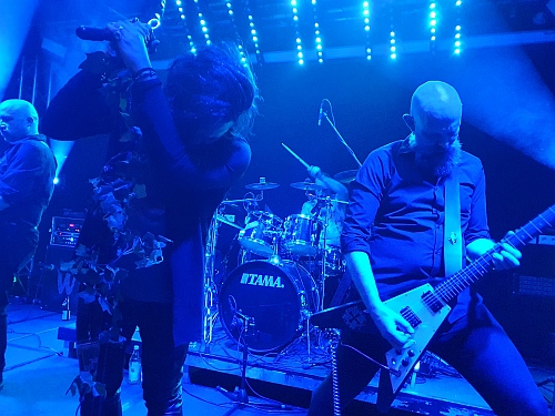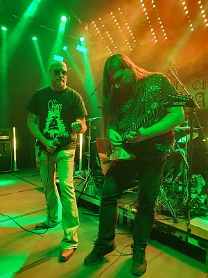 Der kraftvolle Doom-Groover „Into The Coven Of The Damned“ versprüht massiv Hymnenflair, zu „Evangeline“ geht es mal weniger heavy zeitweise elegant-flockig ab, ehe „Falling Down To Hell“ und „Tear Of The Veil Off The Sun“ heftig Adrenalinschub im Headbangend-Faustreckenden Doomvölkchen freisetzen. Beim gedehnte zehn Minuten sich ziehenden Langriemen „Anal Worship Of The Goatlord“ wird's nocheinmal schmutzig und mit CANDLEMASS-Cover von „Solitude“ zum Ausklang im Gepäck einschließlich kraftvoller Schlageugbeats, druckvoller Gitarrenwände und Gerrit's charismatisch raumgreifendem Organ lässt sich erst recht nichts falsch machen. Konzertveranstalter Martin kommt zwischendrin sogar auf die Bühne, feiert den Genreklassiker mit Band und treu ergebenem Doomfankreis im Duett mit Gerrit P. Mutz gebührend ab. - Gelungener Abschluß eines ebenso gelungenen Abends!