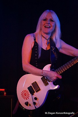 Bandleaderin Kim McAuliffe auf deren Shirt ein silbernes MOTÖRHEAD-Warpig prangt, unter dem England steht, ist nach wie vor mit markigen Sprüchen, coolen Ansagen und purer Lust am Schaffen ein sympathisch ehrliches Original, ebenso Leadgitarristin Jacky Chambers, einmal mehr im knackigen Bühnen Outfit unterwegs - statt Leder heute in Latexhose auftretend, - lässt die Blondine ihre Sechssaitige leidenschaftlich nach allen Regeln der Kunst quietschen, röhren, krieschen, (inklusive zugehörigem Posing), dass es eine Freude ist! Auch die neue Dame am Tieftöner, Olivia Airy (u. a. Bassistin bei dem ebenfalls aus dem U.K. kommenden Speed Metal-Quartett DUNGEON) - fügt sich sehr gut ins Bandgefüge während Schlagzeugerin Denise Dufford mit gewohnt präzisem ebenso wuchtigem Drumming ihre Bandpartnerinnen zu Höchstleistungen antreibt! Ein Set gefüllt durch zahlreiche Klassiker bringt sofort Stimmung ins Publikum. Fleißig mitgehende Kassel-für-Nicht-Kasseler Rockfans haben ebenso ihren Spaß wie heimisches Nordhessen-Fanklientel. Von Anfang bis Ende herrscht super Stimmung im kochenden Ambiente, die gestandene Damenriege sprüht nach allen Seiten vor Energie es gibt fast durchweg Klassikeralarm. Hinzu kommt die lockere Kommunikation mit den Fans. Wieviel Freude es dem voll auf brettharten Rock n'  Roll mit Spaß am Tun eingestellten Damenquartett bereitet, ein hochexplosives die Goldgrube zum Wackeln bringendes Rock n' Roll-Feuerwerk zu zünden, ist ihnen dabei oft anzusehen.