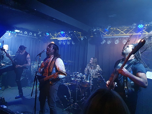 sind trotz überlangem Soundcheck extrem laut eingestellt, - geben auch den letzten Feierwütigen eine rasante von halsbrecherischen Rhythmus-Tempo wechseln geprägte Black-Metal-Abfahrt, die sich gewaschen hat, ungeduldige Gäste vor unserem Tisch rufen: „Ach fangt doch einfach an zu spielen!“ Geschuldet ist das Malheur laut Veranstalter wahrscheinlich dem Paddle-Board von Sänger Kerem, in dem eine Flüssigkeit stand. Shit happens.Fast wie auf Kommando geht’s endlich los: Infernalische Hypergeschwindigkeits-Raserei mit bis zum Anschlag ballerndem Kesselgerumse verbindet sich bei knackig tempo gedrosselten Traditional-Metalpassagen, die je länger die Band auf der Bühne steht, umso besser ihren Rhythmus finden. IMHA TARIKAT funktionieren wie eine gut geölte Maschine. Verstärkt durch ihre straight aufspielende Rhythmussektion: Ventor's Filius Jerome am Schlagzeug und THE NIGHT ETERNAL-Frontmann Ricardo am Bass (!) zeigen IMHA TARIKAT bei Rifforkanen Alarmstufe „Wicked Shrine“, „Sturm der Erlösung“;“Excellent Grief“ und „Radical Reighteousness“ das sie wie bei den Studioalben viel draufhaben. Alle vier sind aufeinander eingespielt, geben (derbes Stageacting inklusive) dem nicht mehr so zahlreich verbliebenen Publikum amtlich auf die Glocke, dass es heftig in den Ohren dröhnt. Technisch ist die Ruhrpott-Schwarzmetall Riege ohnehin über jeden Zweifel erhaben.
